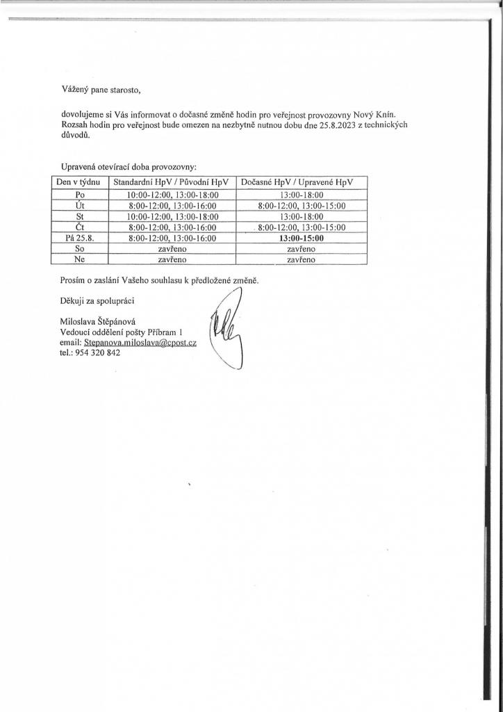 Rozsah hodin pro veřejnost bude z provozních důvodů omezen na nezbytně nutnou dobu ve dnech od 21.8.2023 do 1.9.2023