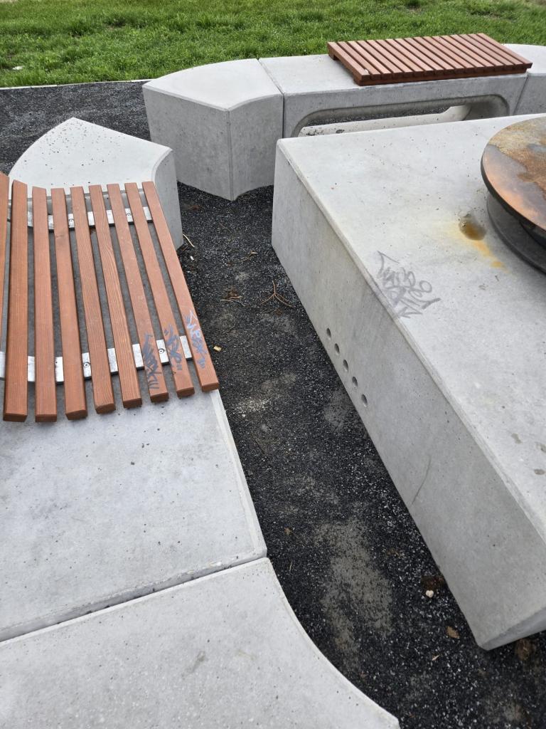 Betonové ohniště a lavičky - Pošlapané, posprejované a počmárané, ohniště plné odpadků, spálené plechovky od piva.