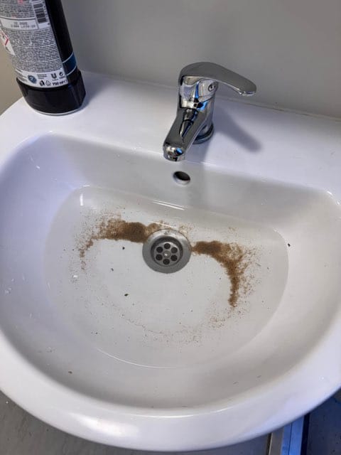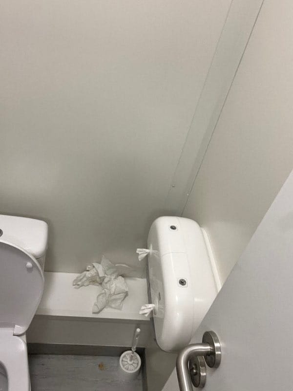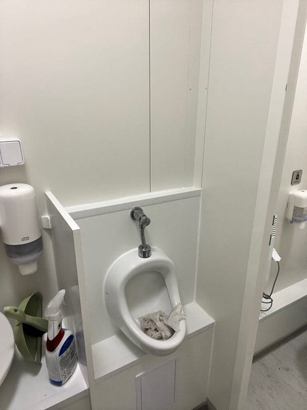 Veřejné toalety - Počmárané, ucpané umyvadlo i pisoár, poházené ubrousky po zemi.