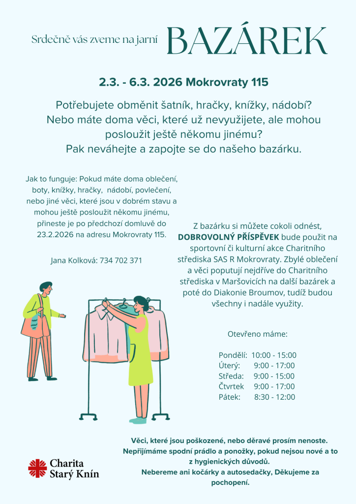 Bazárek funguje na principu dobrovolného příspěvku, který bude použit na sportovní a kulturní akce Charitního střediska SAS R Mokrovarty. Zbylé věci poputují dále do charitních organizací, aby byly i nadále využity.